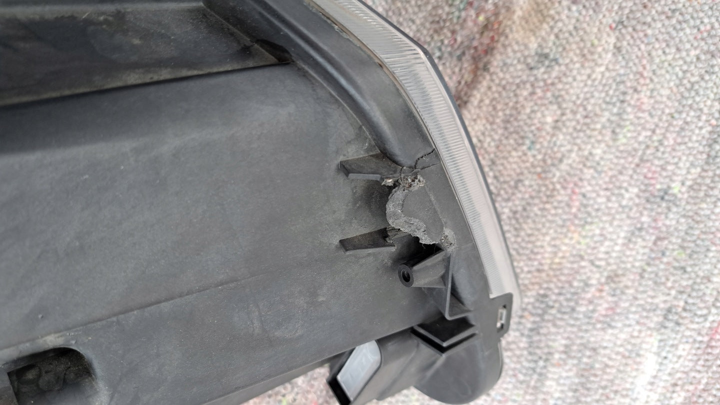Please be aware that this headlight assembly is from a previously owned vehicle and includes a damaged bracket. However, the bracket damage can often be effectively repaired using an original repair kit, allowing for a reliable and secure installation. This repair can typically be performed by those with basic mechanical skills or by a professional if preferred.