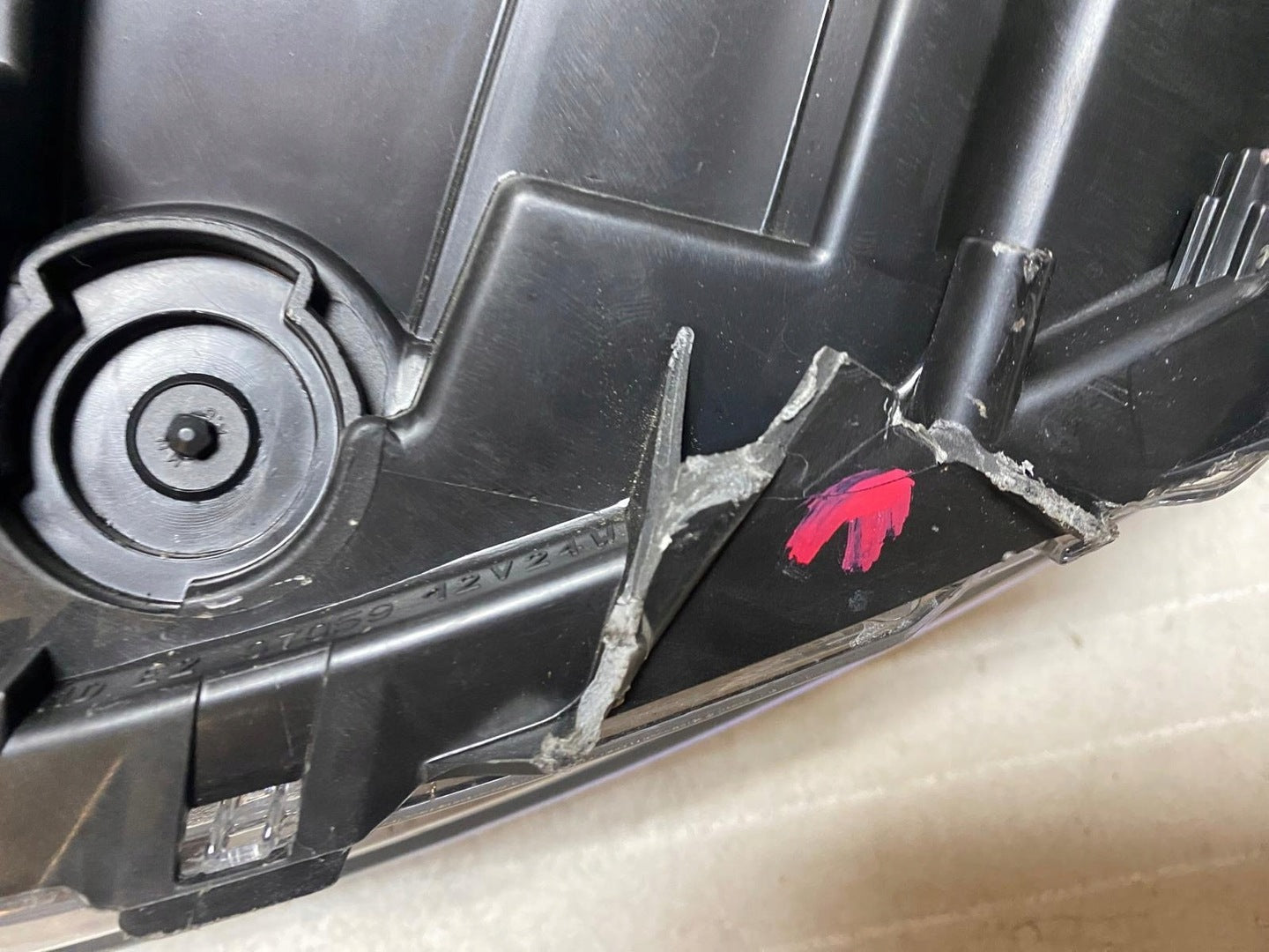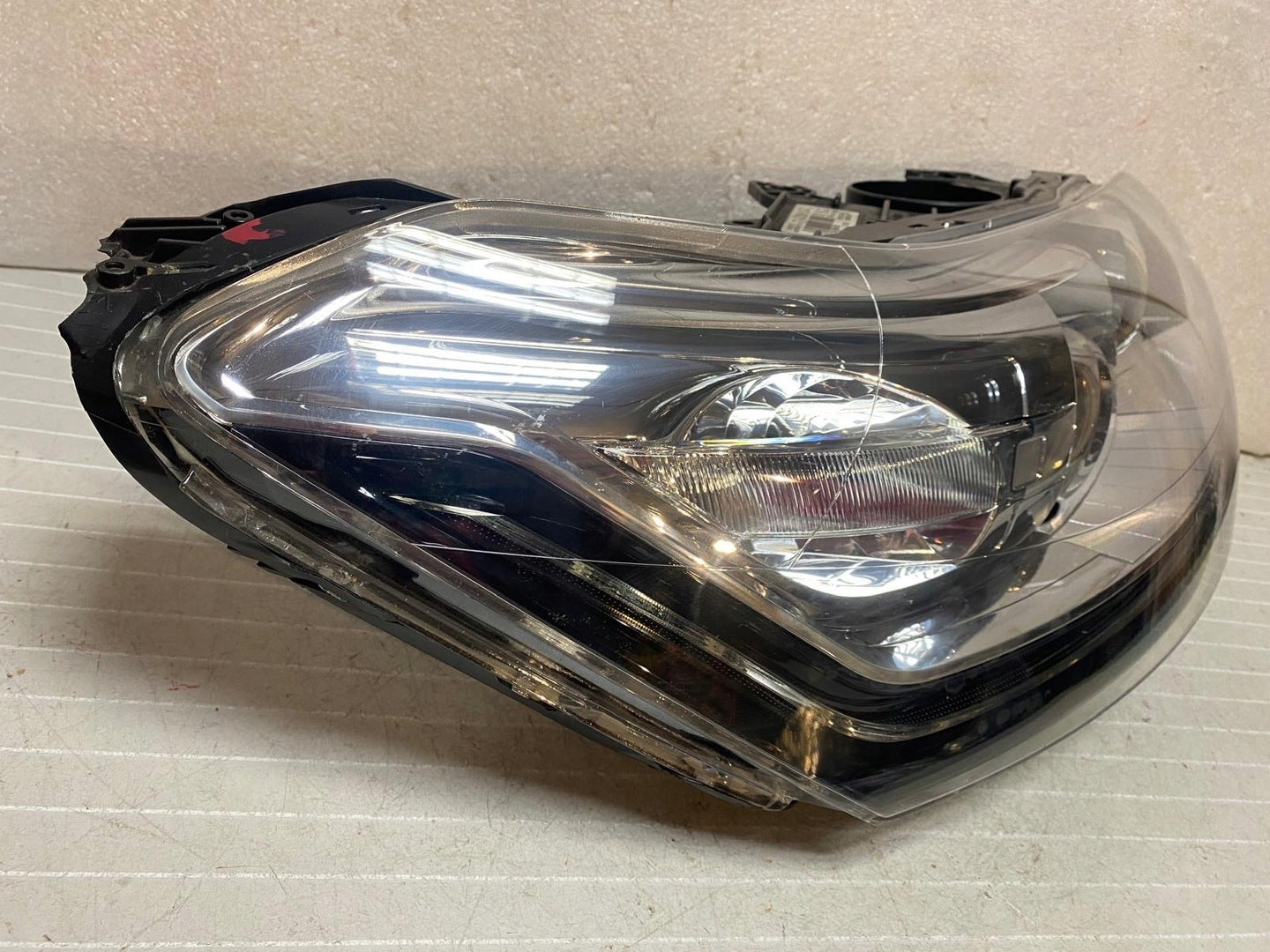 Please be aware that this headlight comes from a previously owned vehicle and has some cosmetic imperfections, including visible scratches on the glass and a damaged bracket. The scratches are superficial and do not impact the headlight's functionality, although they may affect aesthetic appeal for those seeking perfection. The bracket damage can typically be repaired using an original repair kit, enabling a reliable and secure installation that can be performed by individuals with basic mechanical skills or by a professional technician.